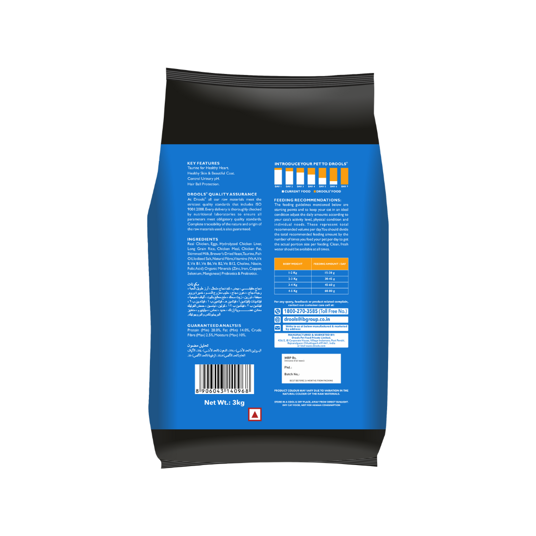 Drools dry cat food with real chicken offers a complete and balanced diet specifically designed for cats. Understanding that cats are often fussy eaters with unique nutritional needs, this formula is crafted with high-quality, delicious real chicken meat to provide optimal protein and energy. This ensures that your cat remains healthy and active.